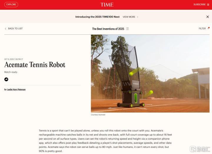 卧安机器人推出的全球首款AI网球机器人Acemate是唯一登上《时代》2025年度最佳发明榜单的运动机器人,成为具身智能技术首次在运动场景落地的里程碑事件。